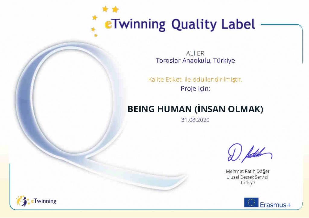 Kurucusu olduğumuz Being Human eTwinning projemiz Ulusal Destek Ekibi tarafından Kalite Etiketi ile ödüllendirilmiştir.